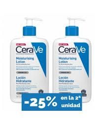 CeraVe Loción Hidratante Para Piel Seca a Muy Seca 473ml X 2 Duplo 25%Dto 2ªUd ¿Qué es CeraVe Loción Hidratante Para Piel Seca a Muy Seca? Es una loción Hidratante que ha sido desarrollada por dermatólogos. Hidrata la piel y ayuda a la restauración de la barrera que protege la piel del rostro y del cuerpo. Apto para niños y adultos. Sin perfume, no comedogénica, formulada para minimizar los riesgos de alergias. Adecuado para una piel con tendencia al eczema. Especial para pieles secas y muy secas. ¿Qué contiene CeraVe Loción Hidratante Piel Seca a Muy Seca? Sus ingredientes son: Contiene 3 ceramidas esenciales y ácido hialurónio que ayuda a retener la natural hidratación de la piel. De tecnología patentada MVE, que permite la liberación controlada para que la hidratación se mantenga durante todo el día. ¿Cómo se usa la loción de CeraVe Para Piel Seca a Muy Seca? Aplícala con generosidad con la frecuencia que estimes necesaria. Apto para niños y para adultos.
