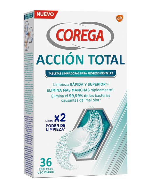 Limpiador para dentadura postiza. Tabletas limpiadoras para prótesis dentales que desinfectan y ayudan a eliminar las bacterias que causan la irritación de las encías* sin dañar la prótesis y cuidando de las partes metálicas de las prótesis parciales. *en pruebas de laboratorio. Formato: 36 Tabletas. Beneficios: Desinfecta y elimina el 99,9% de las bacterias causantes del mal olor en 3 minutos así como otros microorganismos que pueden causar la irritación de las encías en 5 minutos*.*en pruebas de laboratorio. Ayuda a eliminar las manchas sin dañar la prótesis y es apto para las partes metálicas. Modo de aplicación: Tabletas limpiadoras Corega Acción Total. Limpiador de uso diario para prótesis dentales que ofrece un cuidado completo para tu prótesis dental. Desinfecta y elimina el 99,9% de las bacterias causantes del mal olor en 3 minutos así como otros microorganismos que pueden causar la irritación de las encías en 5 minutos*. Ayuda a eliminar las manchas sin dañar la prótesis y es apto para las partes metálicas. Deja la prótesis con una agradable sensación refrescante. *en pruebas de laboratorio.