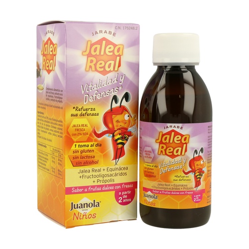 Jalea Real Vitalidad Defensas de Juanola es un complemento alimenticio que contiene jalea real fresca, fructooligosacáridos (prebióticos), equinácea, própolis y zinc.