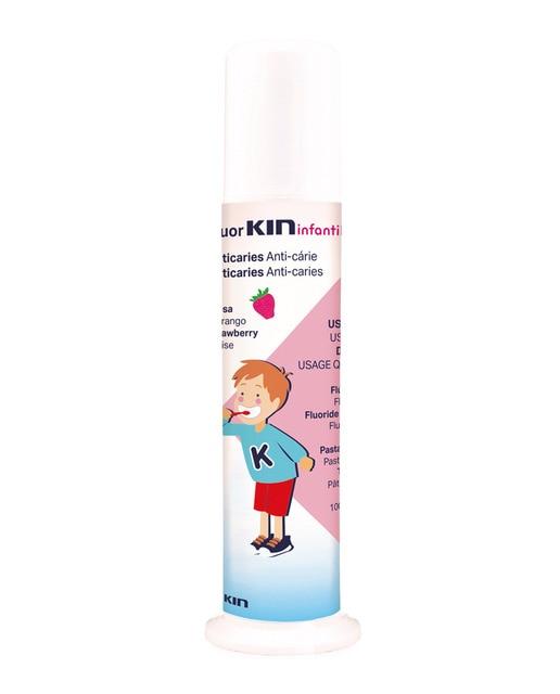 La línea Fluor·Kin Infantil ha sido específicamente formulada para cuidar la salud bucal de los más pequeños. Por su contenido en fluoruro sódico (500 ppm F), previene la aparición de caries y fortalece el esmalte dental. Su agradable y suave sabor a fresa gusta especialmente a los niños. A partir de 12 meses.