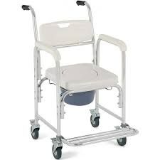 Silla de ducha con ruedas e inodoro fabricada en aluminio. Las ruedas traseras y delanteras incluyen frenos. Asiento cómodo acolchado. Se puede colocar sobre el inodoro del wc. Contiene un reposapiés abatible.