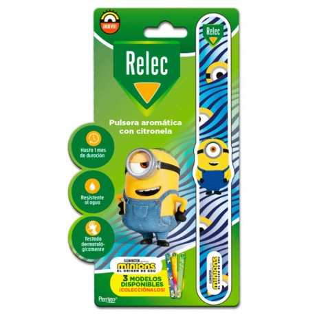 Relec pulsera con citronela de Minions. ¡Ahora, con tus Minions favoritos! Disponible en 3 colores, escoge el que más te guste. Es perfecta para actividades al aire libre y resistente al agua. Apta para niños a partir de 3 años. Relec pulsera con citronela Minions AZUL, pulsera aromática con citronela y juguete extraíble. Ideal para actividades al aire libre, resistente al agua y con una duración de hasta 1 mes. ¡Fácil de usar, cómoda y divertida! Contiene ingredientes naturales como la citronela.